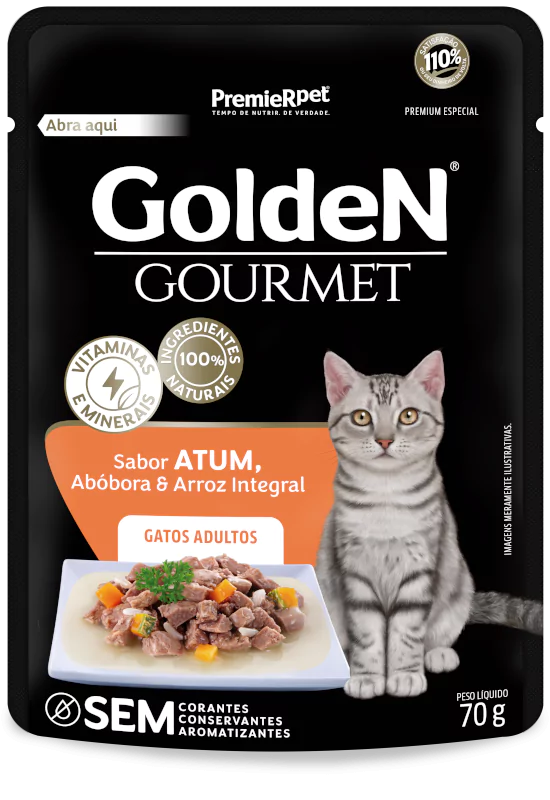 GoldeN® Gourmet Gatos Adultos Sabor Atum, Abóbora e Arroz Integral é um alimento Premium Especial que faz parte da linha GoldeN® Gourmet. Este produto é um alimento úmido completo indicado para gatos adultos saudáveis, pois é enriquecido com vitaminas e minerais possibilitando um suporte às defesas naturais.
