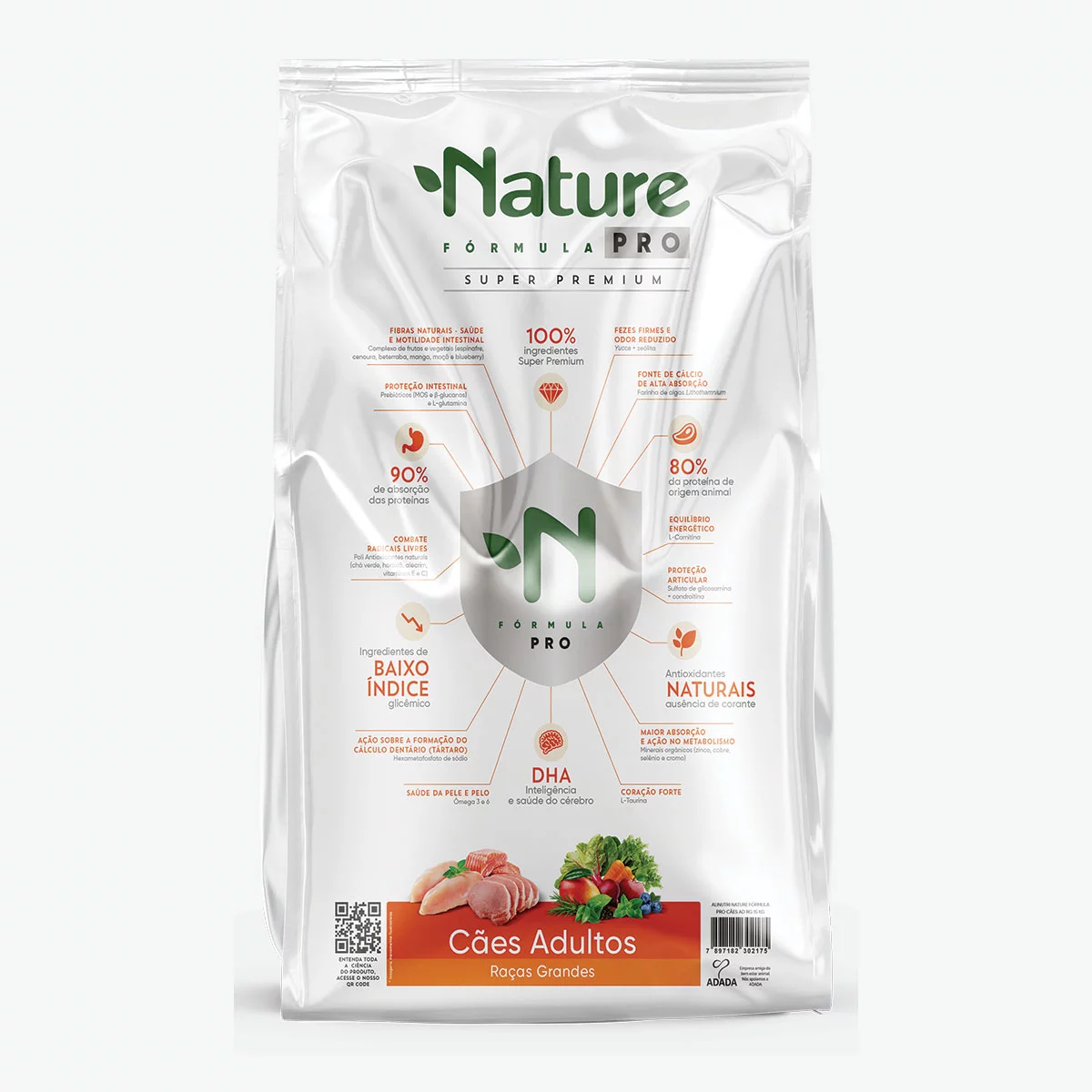 Farinha de vísceras de aves (28,00%), farinha de torresmo (2,00%), farinha de peixes (1,00%), complexo de frutas e vegetais desidratados (espinafre em pó (0,08%), cenoura em pó (0,07%), polpa de beterraba (0,15%), manga (0,10%), maçã (0,10%) e mirtilo em pó – blueberry (0,02%)), arroz quebrado, sorgo integral moído, ervilha moída desidratada, biomassa de microalgas 0,05% (Schizochytrium sp.) – Fonte de DHA, algas calcárias (0,10% – Lithothamnium calcarium), fibra de cana-de-açúcar, óleo de aves, fosfato bicálcico, hemoglobina desidratada de bovino, cloreto de sódio (sal comum), L-glutamina, L-ácido glutâmico, L-taurina, L-carnitina, sulfato de condroitina, sulfato de glicosamina, hexametafosfato de sódio, zeólita, extrato de Yucca Schidigera, ácido propiônico, sorbato de potássio, cloreto de colina, hidrolisado de fígado de aves e suínos, aditivo prebiótico (parede celular de levedura e extrato de leveduras – fonte de prebióticos MOS e Beta glucanos), proteinato de zinco, proteinato de cobre, proteinato de selênio, levedura enriquecida com cromo, antioxidantes naturais – 0,06% (acetato de Dl-alfa-tocoferol, extrato de alecrim, extrato de chá verde e extrato de hortelã) e premix vitamínico e mineral (retinol, colecalciferol, menadiona bissulfito de nicotinamida, tiamina, riboflavina, piridoxina, cianocobalamina, ácido pantotênico, niacina, ácido fólico, biotina, ácido ascórbico polifosfato, selenito de sódio, sulfato de cobre, sulfato de ferro, óxido de manganês, iodato de cálcio e óxido de zinco).