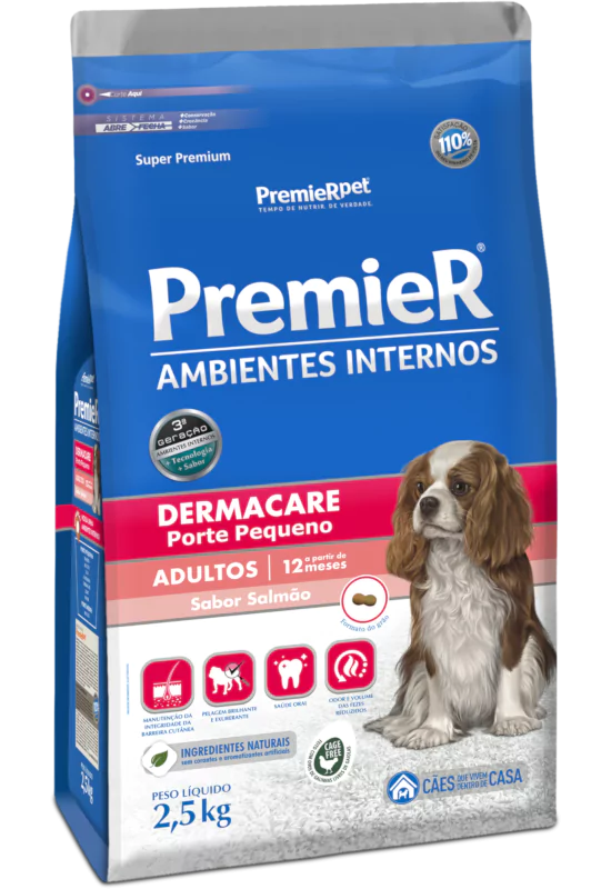 PremieR Ambientes Internos Dermacare é um alimento Super Premium para cães, especialmente desenvolvido para cuidar da saúde da pele e da pelagem. Sua fórmula única, que combina ácidos graxos essenciais e biotina, proporciona uma pele saudável e protegida. Com proteínas selecionadas de alta qualidade, como salmão e ovos, e níveis elevados de zinco, promove uma pelagem exuberante e brilhante para os cães.