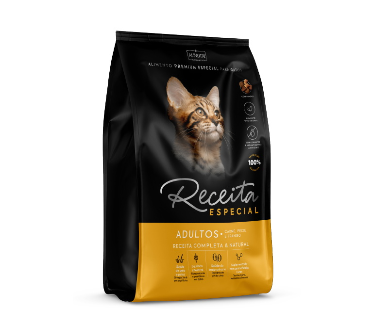 A Receita Especial é um alimento formulado para gatos adultos de todas as raças, oferecendo uma nutrição completa e equilibrada. Este produto é desenvolvido para fornecer todos os nutrientes essenciais que um gato adulto precisa para manter uma dieta diária adequada e saudável. Com uma composição cuidadosamente balanceada, ele assegura que o animal receba todos os elementos nutritivos necessários para suportar sua saúde geral e bem-estar.