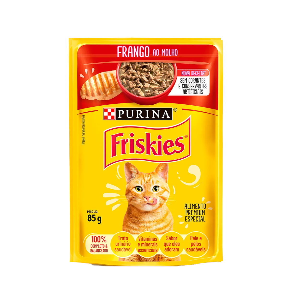 FRISKIES® Frango é um alimento úmido que os gatos adoram, composto por pedaços de carne em molho, sem corantes nem conservantes artificiais. Promove um trato urinário saudável, pele e pelos saudáveis, além de conter vitaminas, minerais essenciais e proteínas de alta qualidade para músculos fortes. Ideal para oferecer como refeição diária, contribuindo também para a hidratação do seu gato.