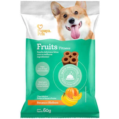 Snacks Fitness Fruits Papaya Pets Banana e Abóbora são deliciosos petiscos saudáveis para cães. Feitos com papaya, banana e abóbora, oferecem vitaminas e fibras essenciais para a saúde do seu pet. Estes snacks são ideais para reforçar a nutrição diária, mantendo seu cão feliz e ativo.