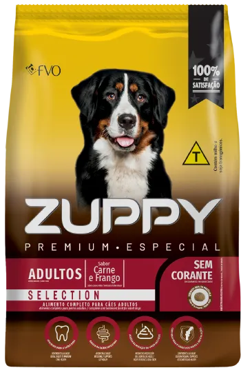 ZUPPY PREMIUM ESPECIAL SABOR CARNE E FRANGO é um alimento seco, completo e balanceado, formulado para cães adultos de todas as raças.